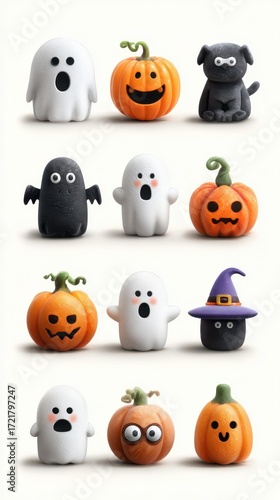 Colorful collection of playful Halloween figures including ghosts, pumpkins, and a dog