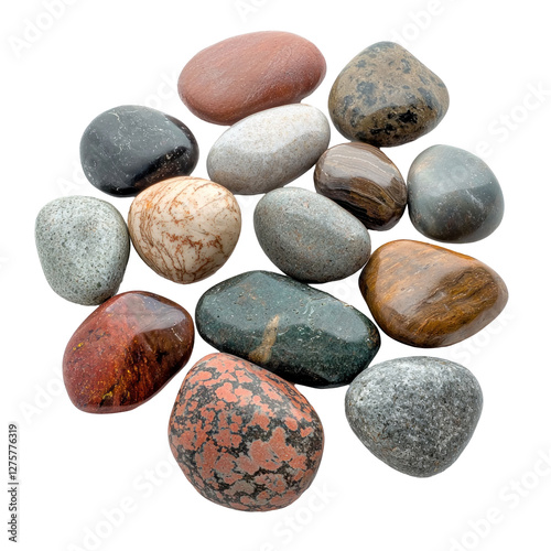Colorful collection of polished stones on white background isolated on png transparent background, cut out