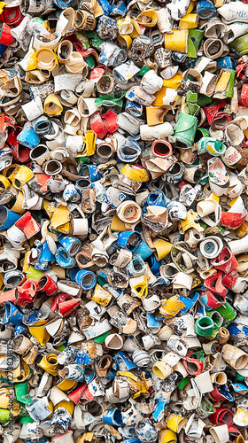 Colorful collection of recycled plastic bottle caps piled together, showcasing vibrant hues and textures