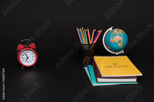 colorful collection of school supplies set on black background. back to school. great ideas