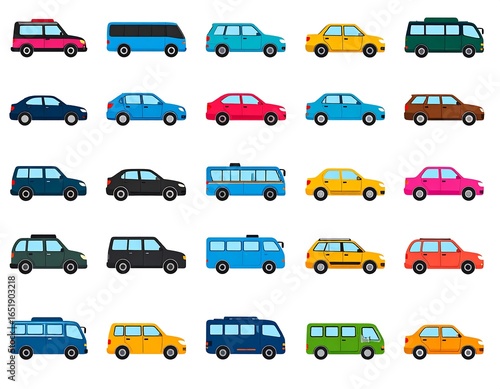 Colorful collection of various vehicles. Flat design, side profiles