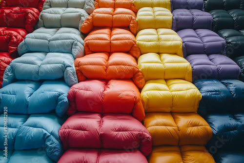 Colorful collection of winter jackets folded and ready for shoppers to browse