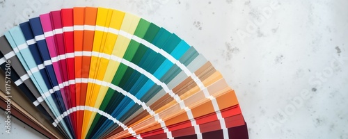 Colorful color palette fan displayed on white concrete wall. Graphic designer examines color swatches. Variety of hues available for design projects. Interior design selection in progress. Selection