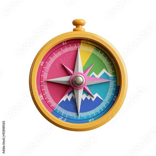 Colorful compass with mountain design. Concept of direction, navigation, exploration, and journey.