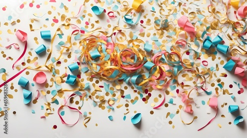 Colorful Confetti And Lively Streamers Artfully Arranged On A Clean White Backdrop Confetti And Carnival Ribbons AI Generative