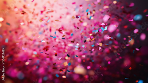 Colorful confetti cascades through the air, creating a festive atmosphere at a celebration. Vivid tones of pink, blue, and gold shimmer against a dark background