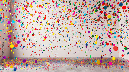 Colorful confetti falling from the top of the image and covering the floor. The background is a white wall.