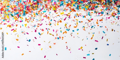 Colorful confetti falls on a white background.