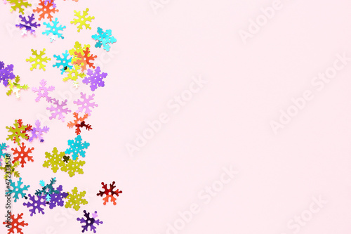 Colorful confetti in shape of snowflakes on pink background
