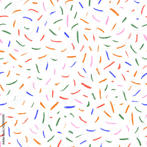 Colorful confetti or sprinkles seamless pattern. Crayon drawn vector strokes, dashes and short lines. Simple creative background with confetti texture. Birthday or party wrapping paper.