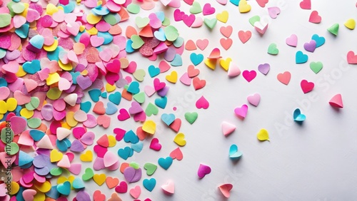 Colorful confetti with pink paper hearts scattered on a white background, creating a playful and festive atmosphere, confetti
