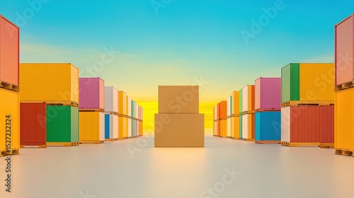 Colorful containers shipping cargo industrial export style. Logistics transport storage freight organization. Export boxes and pallets in vibrant arrangement, modern industrial background, business