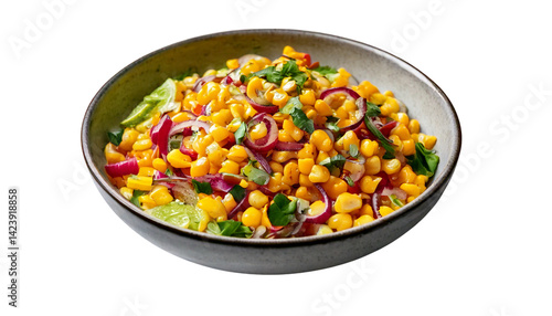 Colorful Corn Salad with Red Onion, Fresh Herbs, and Lime in a Bowl on White Background