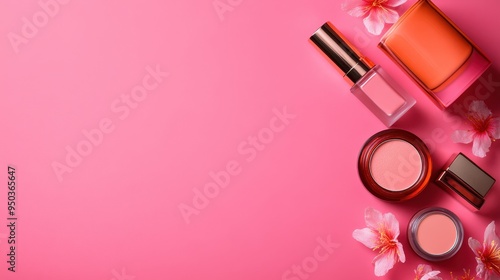 Colorful cosmetic products arranged elegantly on a pink background, complemented by delicate flower petals for a fresh beauty theme.