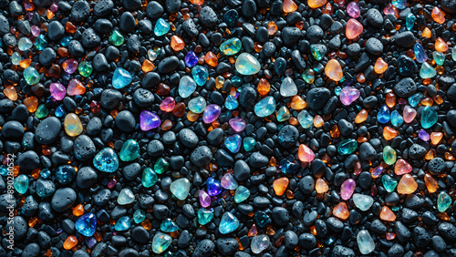 Colorful cosmic smooth round sea pebbles and various stones close-up texture pattern. Naturally rounded gravel at sea shore background for your design. Decorative beach stones gravel in galaxy colors