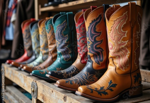 Colorful cowboy boots displayed on a rustic wooden shelf