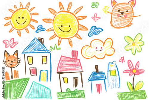 Colorful Crayon Drawing of Sun, Houses, Flowers, and a Smiling Cat in Childlike Art Style with Simple Shapes and Bold Lines in a Cheerful and Playful Outdoor Scene