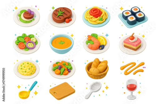 Colorful Culinary Icons. Plated Dish. 3D icons set of plated dish: gourmet plate with garnish, steak with herbs, pasta with sauce, sushi rolls, salad with