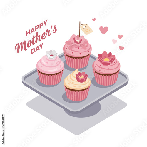 Colorful cupcakes on a tray for Mothers Day in flat vector art
