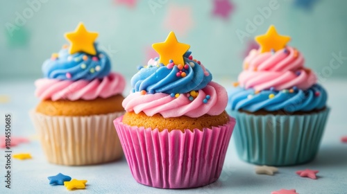 Colorful cupcakes with creamy frosting and star decorations at a festive gathering