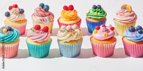 Colorful Cupcakes with Frosting and Fruit Toppings. Assorted Decorated Cupcakes on White Background