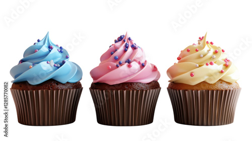 Colorful cupcakes with frosting and sprinkles arranged in a row on a clean surface