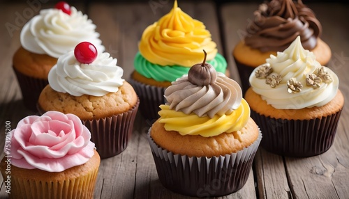 Colorful cupcakes with various topping on wood backgrounds, free space above