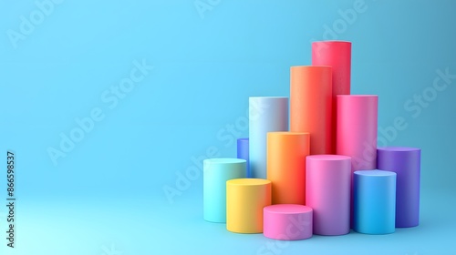 Colorful cylindrical shapes stacked in an artistic arrangement against a blue background. Vibrant colors and geometric design create visual interest.