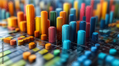 Colorful data visualization display with bars and dots representing analytical information in a modern workspace setting