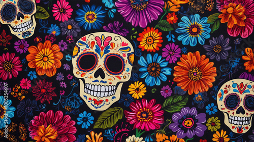 Colorful Day of the Dead skulls amidst vibrant floral decorations celebrating Mexican tradition