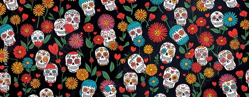 Colorful Day of the Dead Sugar Skulls Pattern with Traditional Mexican Floral Elements Vibrant Dia de los Muertos Seamless Print Featuring Calaveras Hearts and Festive Flowers on a Black Background