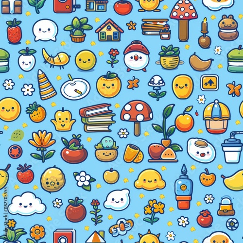 Colorful daycare drawings in a playful chalk pattern featuring toys, flowers, and games galore