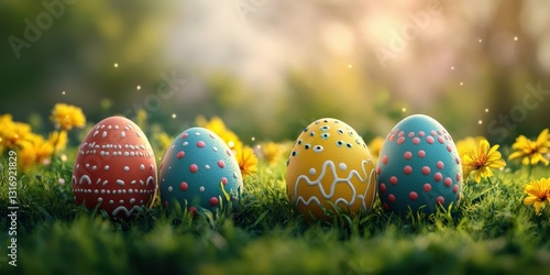 Colorful decorated Easter eggs arranged on green grass among blooming yellow flowers during springtime