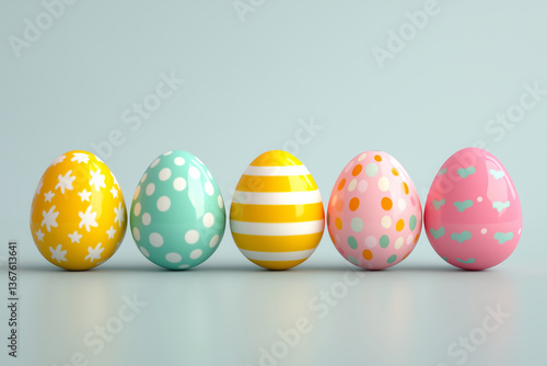 Colorful decorated Easter eggs in row, featuring various patterns like stripes and polka dots, evoke festive and cheerful atmosphere. Perfect for spring celebrations