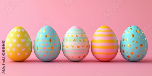 Colorful decorated eggs arranged in a row for spring celebration or Easter festivity