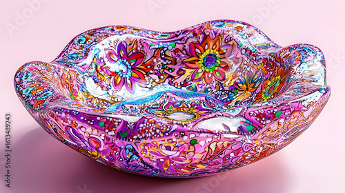 Colorful, decorative bowl with swirling, floral patterns. Intricate designs in various hues