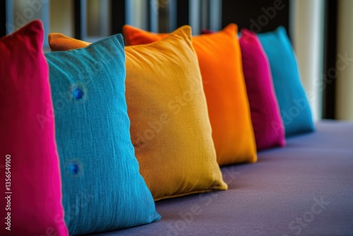 Colorful decorative cushions arranged on a stylish modern sofa in a bright interior setting
