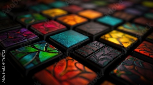 Colorful decorative square boxes arranged in a grid pattern, with intricate designs; abstract background