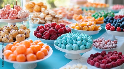 Colorful dessert display with various sweet treats. Assortment of pastries, fruits, and candies on tiered white stands. Vibrant colors on a light blue table