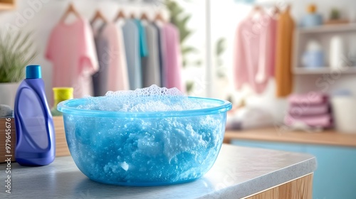 Colorful detergent container with bubbly laundry in a cozy household interior