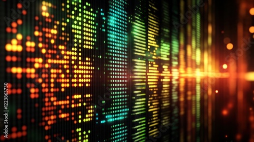 Colorful digital audio spectrum, glowing, abstract background