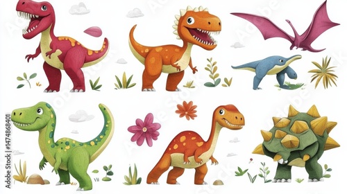 Colorful dinosaurs in a playful landscape.