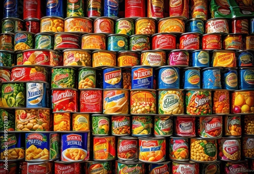 colorful display canned food selections arranged eye catching decorative background, vibrant, colors, goods, bright, packaging, labels, grocery, items, still