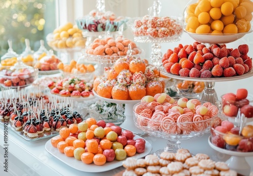 Colorful Display of Assorted Sweets and Desserts on Elegant Table, Perfect for Celebrations, Parties, and Special Occasions, Featuring Various Fruits and Treats