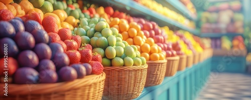 Colorful display of fresh fruits arranged in baskets on shelves at a market.