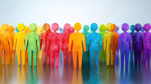 Colorful diverse group of figures standing on reflective surface
