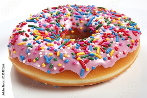Colorful donut with pink icing and sprinkles on a white plate, ideal for dessert photography