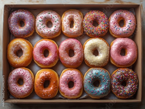 Colorful donuts in a paper box on dark cement background with assorted sweet pastries and sprinkles for dessert snack