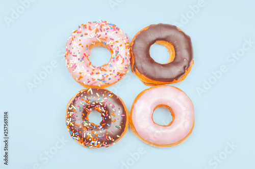 Colorful donuts on pastel blue background.