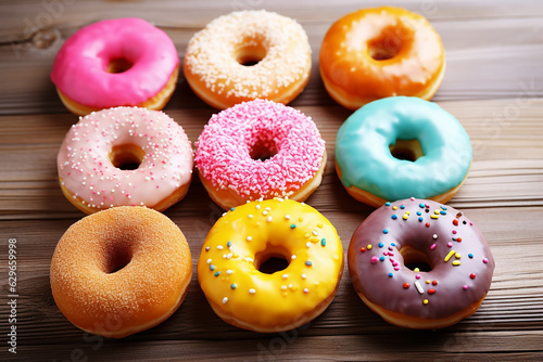 Colorful Donuts on White Wood Background - Created with generative AI tools